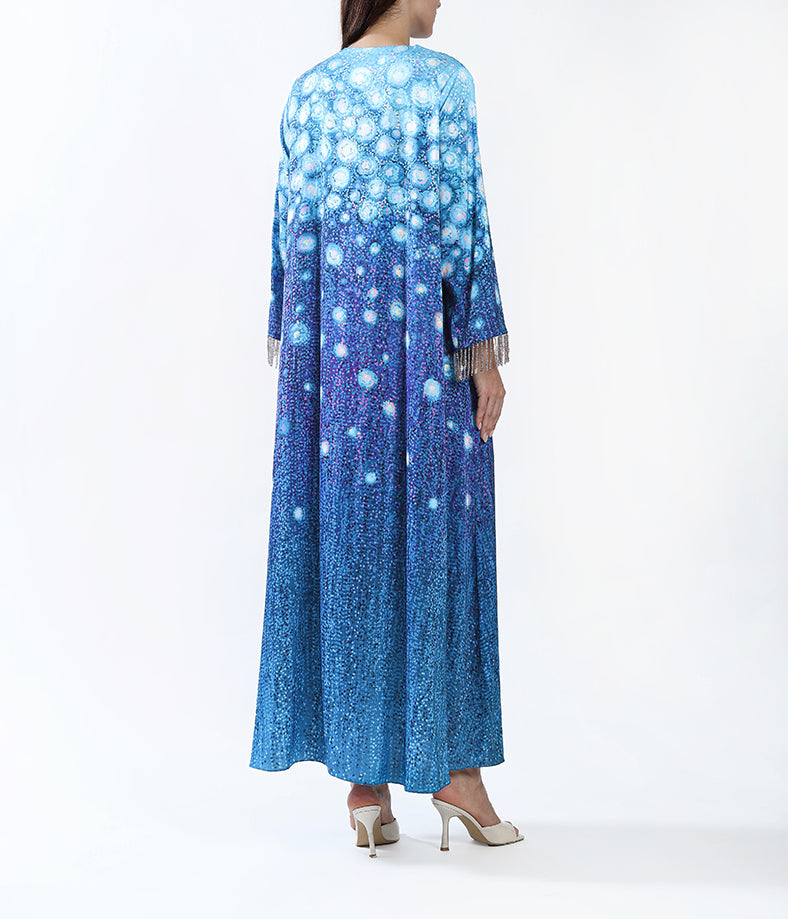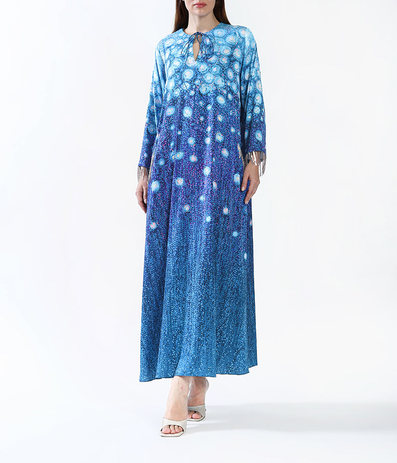 Light silk custom designed kaftan with tassels.