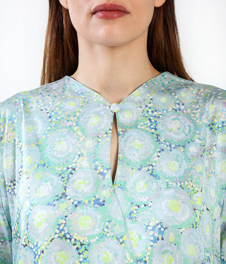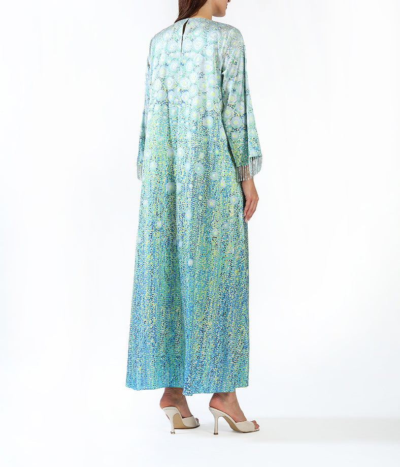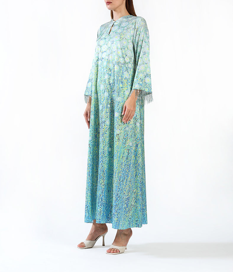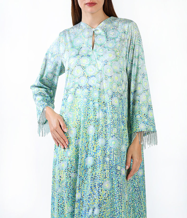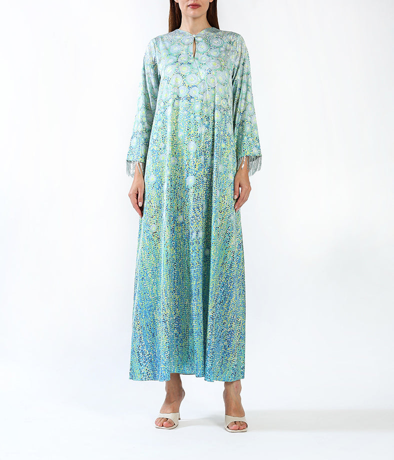 Light silk custom designed kaftan with tassels.
